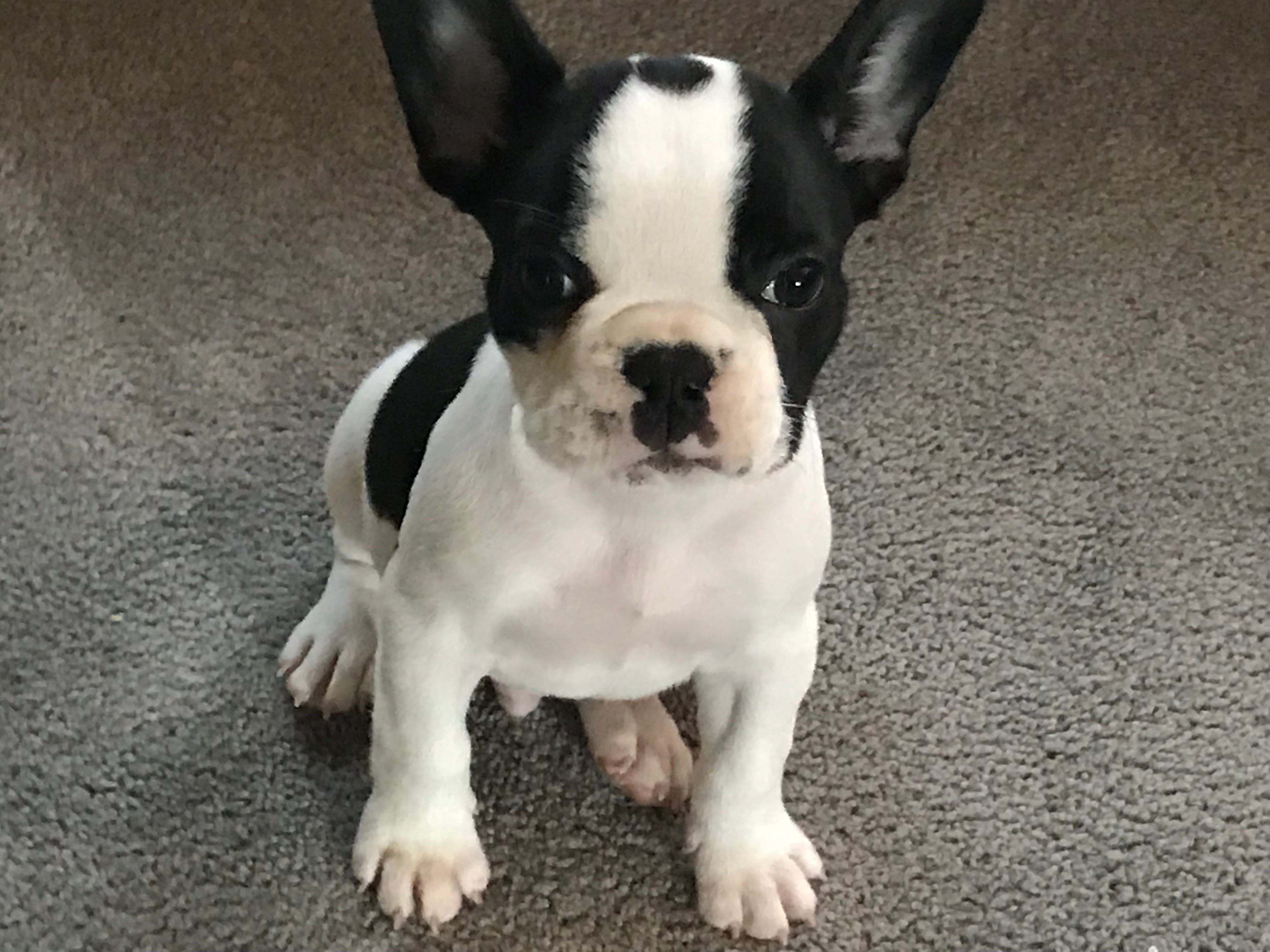 So I quickly succumbed—not like I had a choice—and the wife and I sat together on the couch, surfed on our phones to the Puppy Spot (internet puppy purchasing store), and gasped—no, gagged a little—at the cost of a Frenchie. But after just a few minutes of scrolling, I stopped on an adorable, pied Frenchie pup (a pied is a French bulldog with a white coat and large, dark-colored patches).